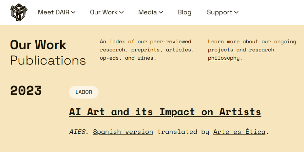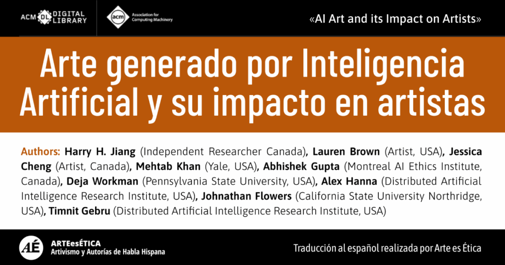 ► Realizamos la traducción al español del paper AI Art and its Impact on Artists, publicado por el DAIR Institute, de los autores: Harry H. Jiang, Lauren Brown, Jessica Cheng, Mehtab Khan, Abhishek Gupta, Deja Workman, Alex Hanna, Johnathan Flowers, Timnit Gebru.
