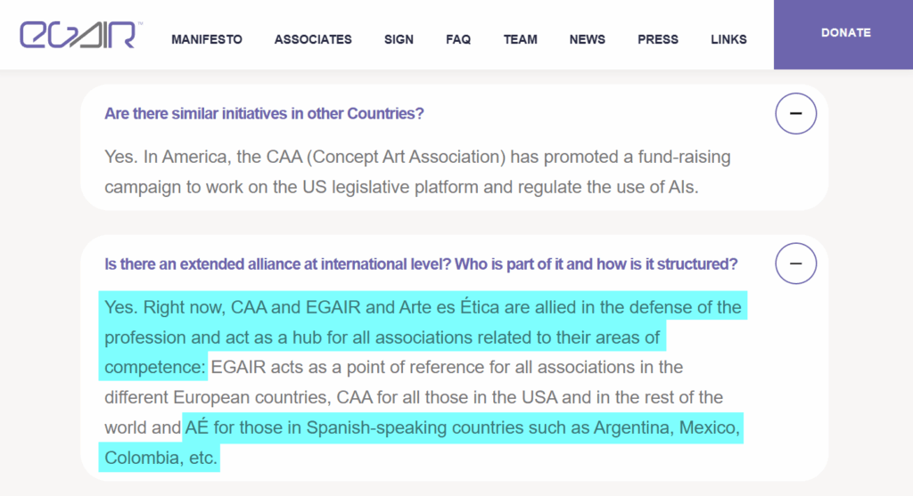 ► Formamos alianza con la European Guild for AI Regulation (EGAIR) y la Concept Art Association (CAA) y apoyamos algunas acciones impulsadas por The Human Artistry Campaign, una alianza mundial multisectorial de más de 150 organizaciones de 33 países.