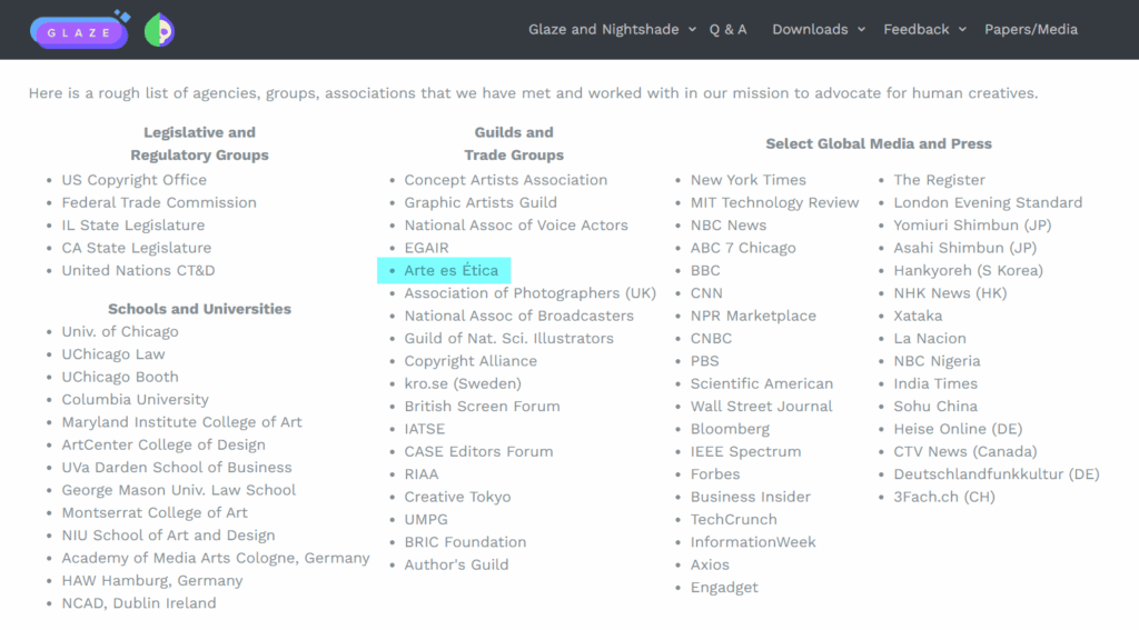 ► Colaboramos con Ben Zhao y el equipo Glaze/Nightshade, junto a otros grupos y asociaciones con los que compartimos la misión de defender los derechos de los trabajadores creativos.