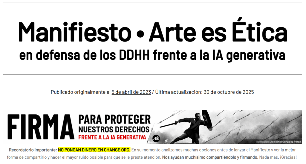 Arte es Ética es un colectivo sin fines de lucro que surgió a fines de 2022 a raíz de la irrupción de la IA generativa en nuestros campos artísticos y que está integrado por profesionales creativos y artistas visuales independientes (ilustradores, diseñadores gráficos y audiovisuales, fotógrafos, animadores, pintores, artistas 3D, entre otros) de Latinoamérica y España, cuyo principal objetivo es informar sobre cómo afecta la IA generativa a todos los sectores creativos y acercar esta información a los representantes políticos de los diferentes países de habla hispana, para que establezcan normativas que protejan a las personas de las prácticas abusivas de las corporaciones tecnológicas.