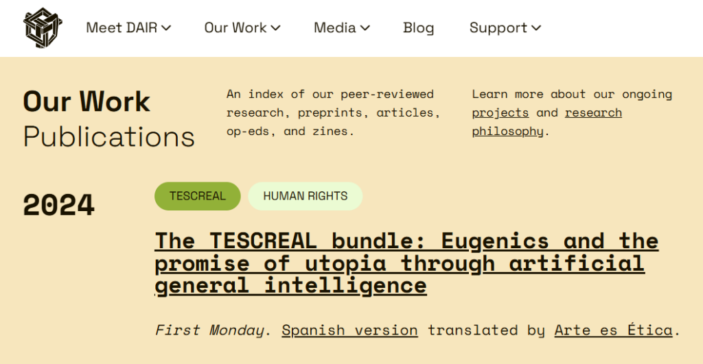 ► Realizamos la traducción al español del paper The TESCREAL bundle: Eugenics and the promise of utopia through artificial general intelligence, publicado por el DAIR Institute, de los autores: Timnit Gebru y Émile P. Torres.