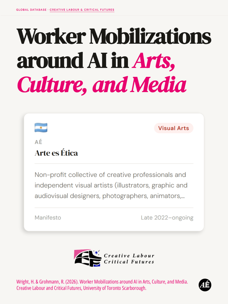 Wright, H. & Grohmann, R. (2026). Worker Mobilizations around AI in Arts, Culture, and Media. Creative Labour and Critical Futures,